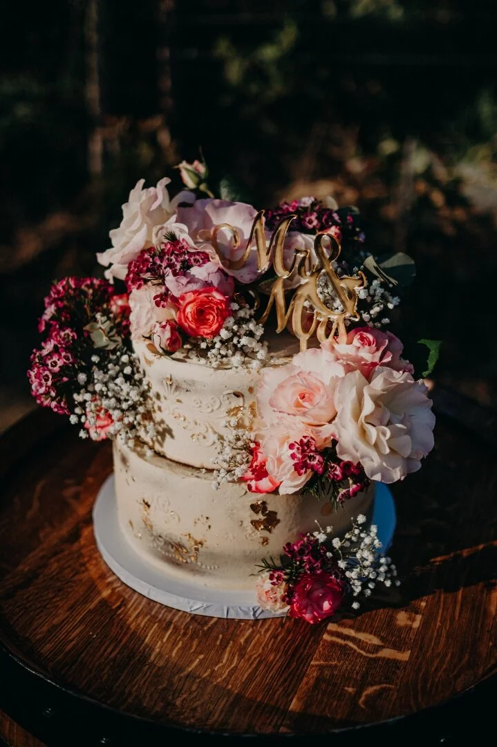 White Chocolate and Raspberry- white chocolate mud cake filled with a raspberry compote and white chocolate ganache. Filled with vanilla bean buttercream